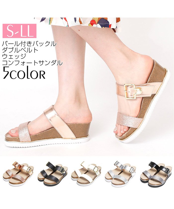 パール付きバックルダブルベルトウェッジコンフォートサンダル