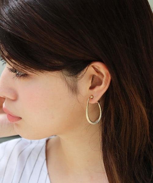 きらきらと細かな光を放つスターダスト加工のフープのイヤリング。太めの大胆なフォルムが目を引く、華やかなデザインです。女性らしさが際立つドロップ型のイヤリングは、デイリー使いはもちろん、フォーマルにもぴったりです。
