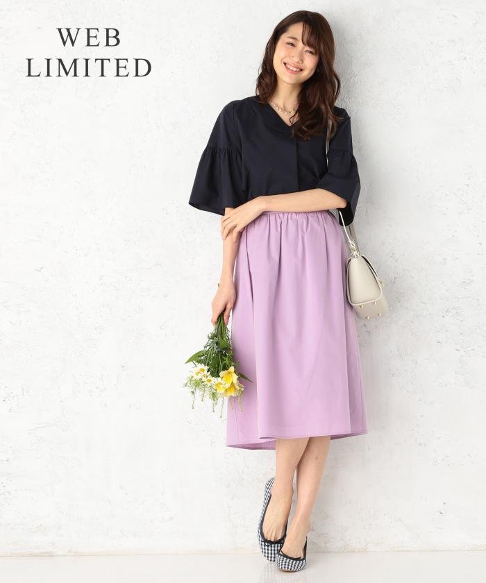 【組曲×MOREスペシャルコラボアイテム発売決定!】今回の「コラボアイテム」は、””フレア袖のブラウス””と””ミモレ丈スカート””のセットアップ!昨年秋冬に大好評だった、集英社ファッション誌MOREのスタイリストと組曲企画チームと精力を傾けて作ったコラボ商品の第2弾!ついに完成いたしました。 Vネックとボタン付きクルーネックの「前後着用出来るブラウス」と、ウエスト部分の折り返しで「レングス調整出来るAラインのスカート」のセットアップです。トップスはトレンドのフェミニンな袖コンデザインとV開きの衿がすっきりと鎖骨をキレイ見せしてくれる大人可愛いデザインで、スカートは表面の綺麗なこだわり素材にフレアに広がるシルエットが女性らしいアイテムです。トップスとスカートは今旬の柄&カラーを組み合わせた選べるカラーを展開。お仕事シーンにも対応する上品さと、今年らしい着映え感を兼ね備えた5パターンで企画しました。コーディネートいらずで、手抜き感ゼロ!上下共に2WAYのデザインで、セットアップで着るのはもちろん、別々に着回しも出来る優秀アイテムです。特別に、”WEB”と一部の”POP UP SHOP”限定で、知的で女性らしい「ネイビートップス」×大人可愛いトレンドカラー「ラベンダースカート」をご用意いたしました。お早目にチェックして下さい。 ■素材<無地部分>タテ・ヨコに、超長綿のスーピマをブレンドしたC60/1コンパクト糸(コンパクト紡績)を使用することによって、非常に毛羽が少なく、光沢感があり、より上質な面になることが特徴です。コンパクト紡機を通す工程で撚糸をかけるため、風合いが柔らかく、洗濯後の劣化が軽減されます。さらに後加工で、ツバキオイル配合樹脂で仕上げることによって、保湿性が高く柔らかい風合いになります。