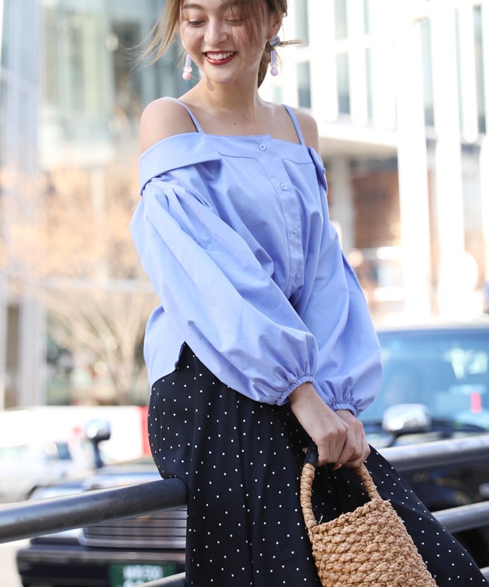 ■たっぷりバルーンスリーブ☆オフショルダーブラウス■ 大胆オフショルダーとたっぷりバルーンスリーブの組み合わせが トレンドムードなオーバーブラウス。 肩紐付きで脱げてこないので、気軽にオフショルを楽しめます。 シワになりにくい素材で、お手入れも楽チンなのも嬉しいポイント。 ボタンと衿のデザインが、カッチリとしたクラシカルなアクセントに。 遊び心たっぷりのガーリーブラウスに仕上がっています。 モデル:168cm 着用カラー:ブルー(83) 伸縮性:なし 裏地:なし 透け感:薄い色あり 生地の厚さ:薄手 肌ざわり:ブラウス素材