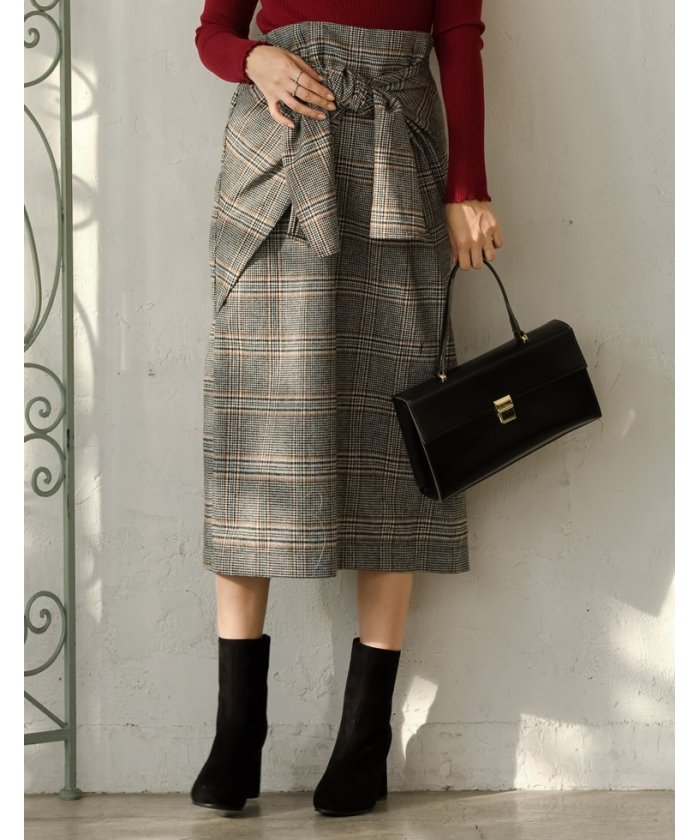 女性らしいフロントリボンが印象的なロングスカート 【デザイン】 両サイドから巻きつけたような大きなリボンが目を惹く、女性らしい一着。 キュッと結んだリボンがウエストをすっきりと見せスタイルアップ効果も。 バックに深めのスリットを入れ、細身過ぎず着心地の良いタイトシルエットに仕上げています。 【コーディネート】 コンパクトなトップスをタックインして、上品にすっきりとまとめて。 スカートが主役のコーディネートを楽しんでいただけます。 【素材・着用感】 チェックは起毛感のある柔らかいウールタッチ生地、無地タイプはメルトンのようなややハリのあるウールタッチ生地です。 無地タイプの方がハリ感があるため、着用時にAライン風のシルエットになります。 ※縫製の都合上、生地の縫い目の柄にずれが生じる場合がございます。あらかじめご了承ください。