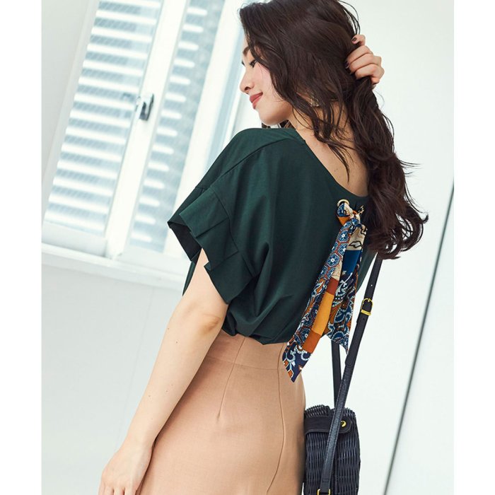 背中にあしらわれたスカーフがレトロ+レディなムードのカットソー。 スカーフは無地のリボンとも付け替え可能で、スタイリングの幅が広がるアイテムです。 タックデザインでふわりと広がるスリーブもコーディネートのポイントに。