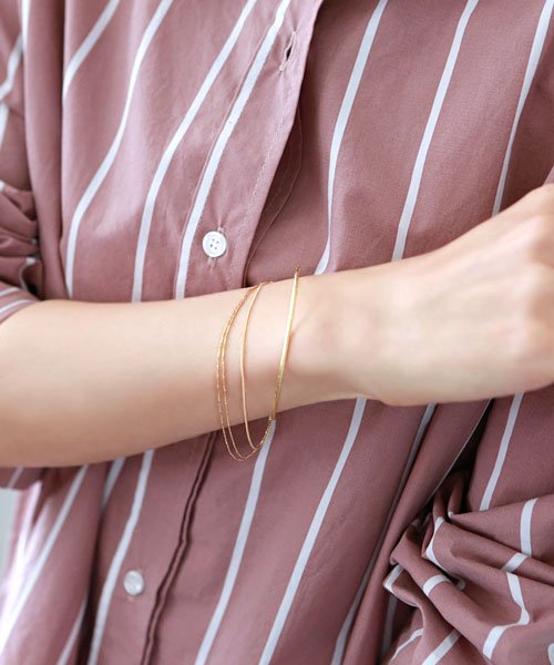 キラキラと輝くスターダスト加工の細めバングルに、華奢な3連チェーンを合わせたデザインのブレスレットです。 繊細で軽やかな、女性らしい手元を演出します。 主張しすぎないデザインなので、重ね付けや腕時計とのコーディネートももおすすめ。 普段使いからパーティーシーンまで幅広く使える優秀アイテムです。
