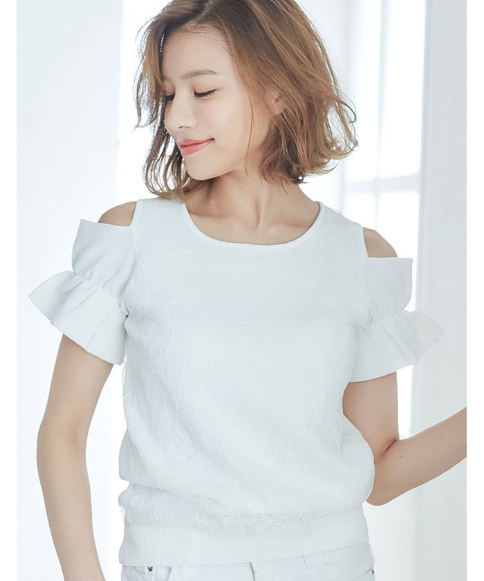 柔らかく着心地の良いサマーニット。 【デザイン】 フロントに繊細なレースを重ねたニットソープルオーバー。 控えめな肌見せが上品な印象を演出するオープンショルダーデザインです。 【コーディネート】 すっきりと着こなせるコンパクトなサイジングなので、ボトムスも細身のものがおすすめ。 フレアスカートやワイドパンツはウエストをタックインすればバランス良く着こなしていただけます。 【素材・着用感】 レーヨン混のニット地は柔らかく伸縮性があり、着心地の良い生地です。 【長くご愛用いただくために】 レーヨンは水に濡れると強度が低下し、お洗濯により多少縮むことがございます。 ご家庭でお洗濯する場合、洗濯機に「手洗いコース」「ドライコース」等の機能がありますが、手洗いをおすすめいたします。 洗濯機は脱水の時だけ洗濯ネットに入れて使用し、乾燥機能は避けてください。