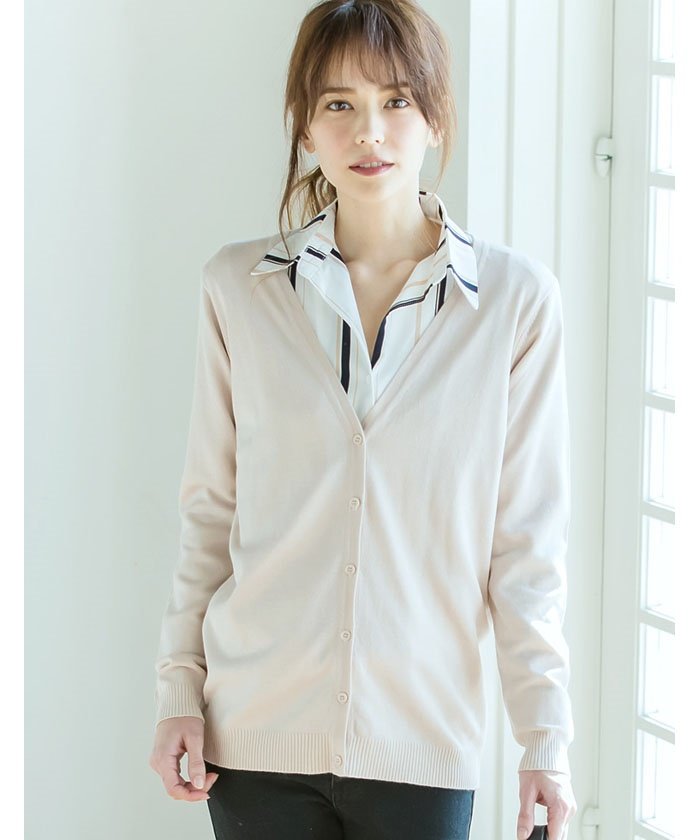 しっとり柔らかい肌触りで、着心地の良い高見えニットカーディガン 【デザイン】 シンプルなアイテムだからこそ、大人の着こなしにマッチするシルエットにこだわりました。 身幅やシルエットはもちろん、ボタンのサイズ、位置なども各タイプ一番キレイに見えるデザインを採用。 ボタンを全て開けて着用したとき、ひとつだけ閉じたとき、全て閉じたとき、どれも違和感なくスッキリと着用していただけるようになっています。 【コーディネート】 春カラーはカジュアルスタイルの差し色にぴったり。合わせやすい丈感なのでデイリーに活躍します。 同シリーズのトップスと合わせるとアンサンブルとして着用可能。オフィスでも活躍するアイテムです。 【素材・着用感】 滑らかな肌触りのレーヨンと弾力性のあるナイロン糸で編み上げています。 程良くストレッチするのでリラックス感のある着心地です。 56丈タイプはややドルマン風の身頃でシャツなどとのレイヤードもしやすいです。 68丈タイプはお尻まで隠れる丈感なので気になる腰周りをカバーします。 ◆Vネック 56丈、68丈の2タイプ。 ※丈によってリブの幅、ボタンのサイズが異なります。 ◆Uネック 56丈。 ※Vネック56丈タイプと同様のリブ幅、ボタンサイズになります。 【取り扱い方法】 レーヨンは水に濡れると強度が低下し、お洗濯により多少縮むことがございます。 ご家庭でお洗濯する場合は、必ず洗濯表記をご確認ください。