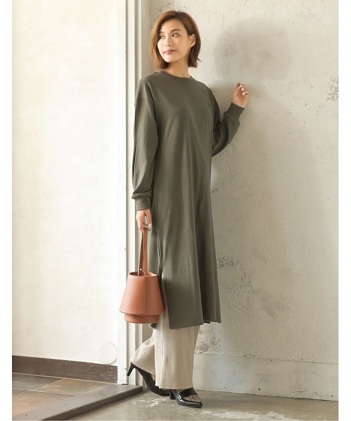薄手のスウェットのようなカジュアルな風合いと デザインが印象的なワンピース。 フロントを走るステッチや、サイドスリットがこなれ感のあるカジュアルスタイルに導きます。 スタイリングしやすい膝下丈なので、1枚でワンピースとして着るのはもちろん ボトムスとのレイヤードスタイルもおすすめです。 素材・着用感 秋・春に着用いただける 薄手のスウェットのようなコットン100%カットソー生地。