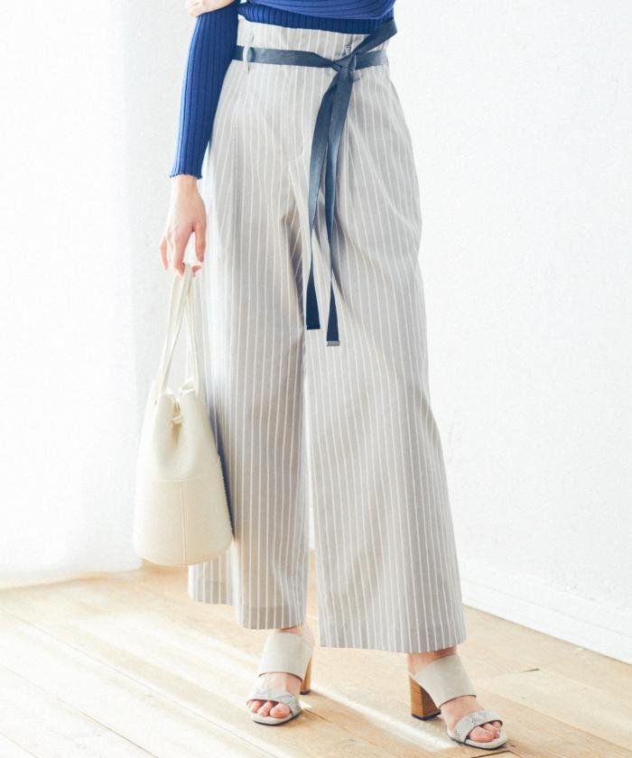ストライプが印象的。ハイウエスト×ワイドシルエットが今年らしい、クロップドワイドパンツ■デザイン■フロントにタックの入ったハイウエストのクロップドワイドパンツです。後ろのみウエストゴム仕様なので、前からのきちんと見えと着心地の良さが叶います。ベーシックなニットプルオーバーや、きれい目ニットアンサンブルとのスタイリングがおすすめです。■素材■イタリアALBIATE社の素材。糸の収縮性や吸水性、摩耗などの耐久性に優れた単糸を使用し、平織りとサテン織りの切り替えでストライプにしています。単糸の打ち込みを良くし、ハリ感がありつつもソフトな風合いを引き出しており、シワになりづらいのも特徴のひとつです。ご家庭で手洗いできる点も魅力です。■同素材アイテム■フレアスカート(品番:SKWOYM0351)※ 画像はサンプルを使用している為、実際にお届けする商品と仕様やサイズが異なる場合がございます。