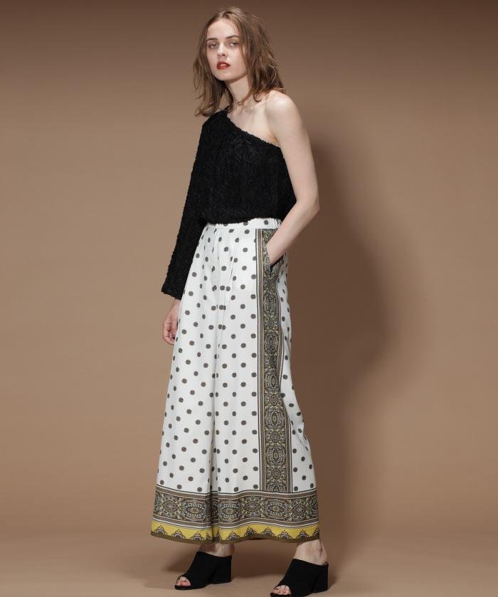 落ち感のある柔らかな素材に、エスニックなパターンプリントが映えるパンツ。コーディネートがぱっと華やぐので、お手持ちのトップスと合わせるだけでぐっとお洒落な雰囲気に。清潔感あるホワイト・秋らしい深みのあるブラウン・上品にご着用いただけるブラックの3色展開。ウエストはゴム&ドロスト仕様でストレスフリーにご着用頂けます。