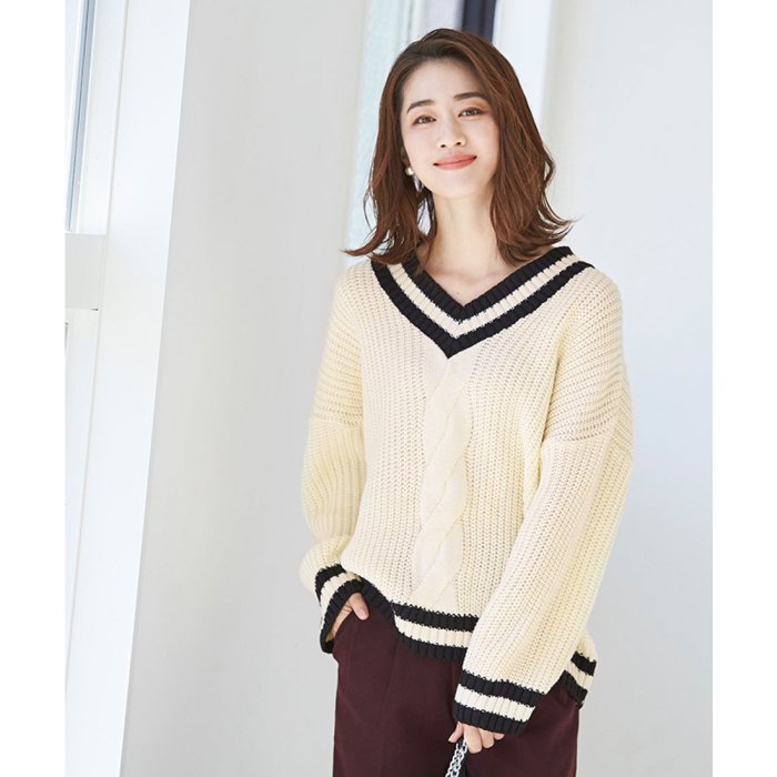 程よく開いたVネックにチルデンデザインのラインが、マニッシュな印象を与えるニットプルオーバー。 フロントのケーブル編みがアクセントになり、一枚で主役級のアイテム。 ゆったりとした身幅で、腰回りが隠れる丈感なので体型カバーも叶えます。 スキニーや細身のボトムスを合わせて、メリハリを意識したスタイリングがオススメです。