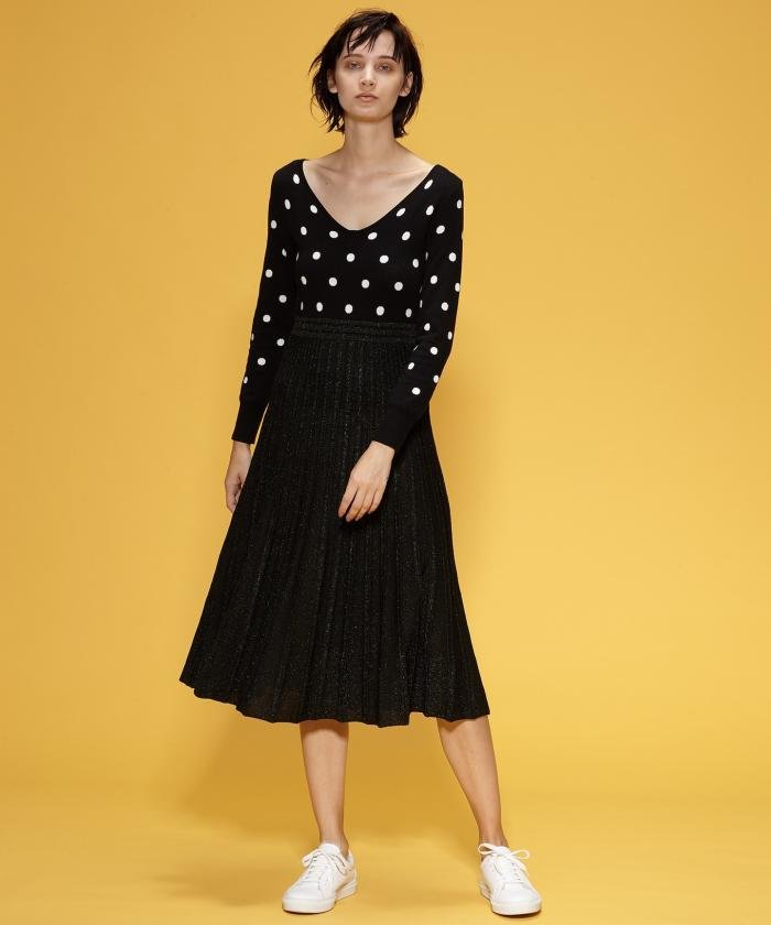 トップにはドットジャガードニットを、スカートにはラメ入りプリーツニットをコンビネーションにしたワンピース。 大人の女性も着こなしやすい、フィットアンドフレアのクラシカルなシルエットでお作りしました。 ニット特有のリラクシングな着心地ながら、見た目はきちんと感のある嬉しいデザイン。 プリーツの端正な表情と、女性らしい深めのVネックもアクセントに。 一枚で着映えする主役アイテムです。